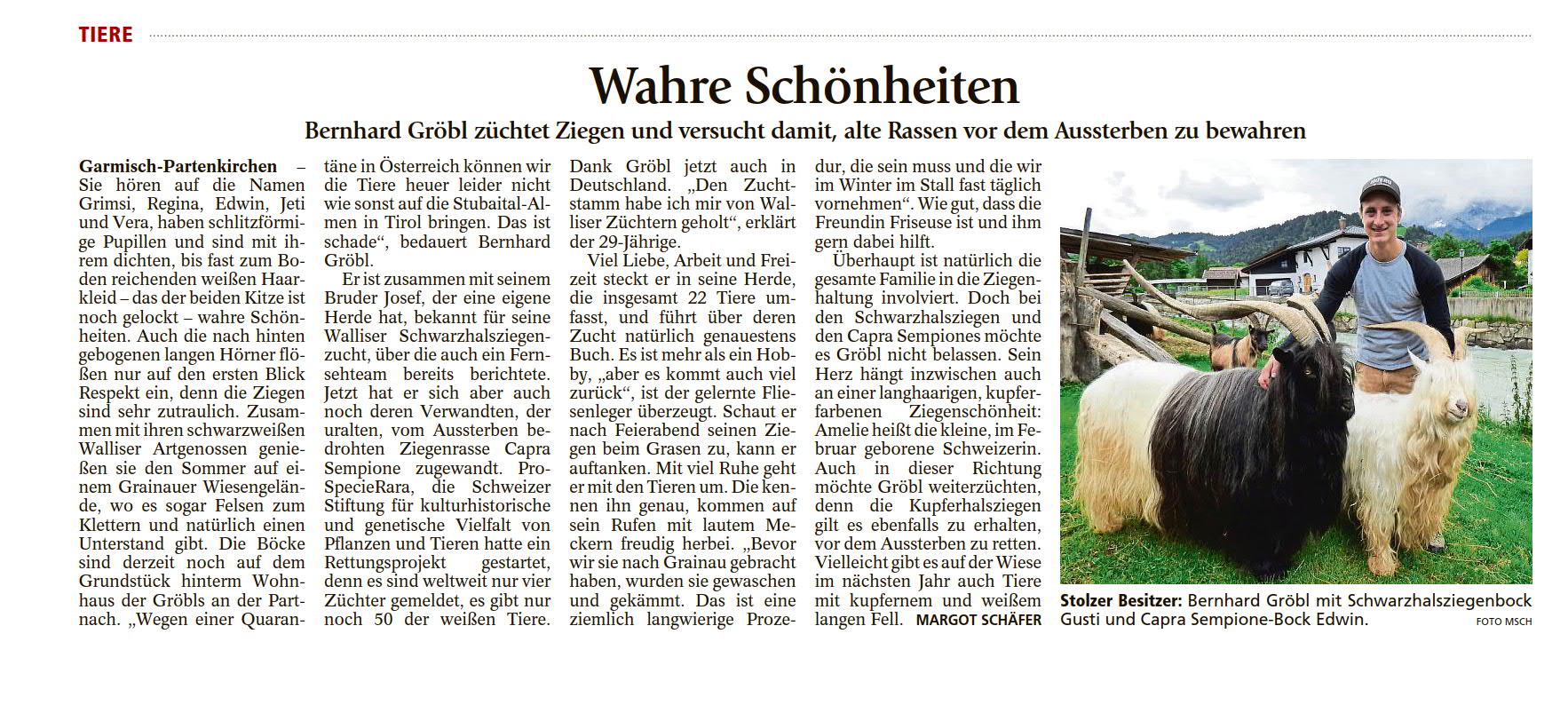 Presse2016Quelle: Garmisch-Partenkirchner Tagblatt 05.06.2016 Hier könnt Ihr den Artikel als pdf-Datei herunterladen und vollständig lesen: 2015Schweizer Pressebericht"Walliser Ziegen auf bayrischen Wiesen" 2014FernsehberichtUnserer Schwarzhalsziegenzucht wurde in der Sendung "Stadtrundgang" mit Christopher Griebel Und hier geht's zum Video in der Mediathek von münchen.tv: ZeitungQuelle: Garmisch-Partenkirchner Tagblatt Oktober 2014 FernsehberichtFernsehsenung "Wir in Bayern" im Unserer Schwarzhalsziegenzucht wurde in der Sendung "Wir in Bayern" 2013Quelle: Die Welt am Sonntag 30. Juni 2013 Hier könnt Ihr den Artikel als pdf-Datei herunterladen und vollständig lesen: oder gleich online auf www.welt.de lesen 2011Quelle: Garmisch-Partenkirchner Tagblatt Oktober 2011 Quelle: Bezirksblätter Stubai-/Wipptal 19. Oktober 2011 2010Quelle: Garmisch-Partenkirchner Tagblatt Oktober 2010 Quelle: Garmisch-Partenkirchner Tagblatt Oktober 2010 2006Quelle: Garmisch-Partenkirchner Tagblatt Oktober 2006 |